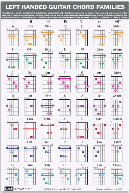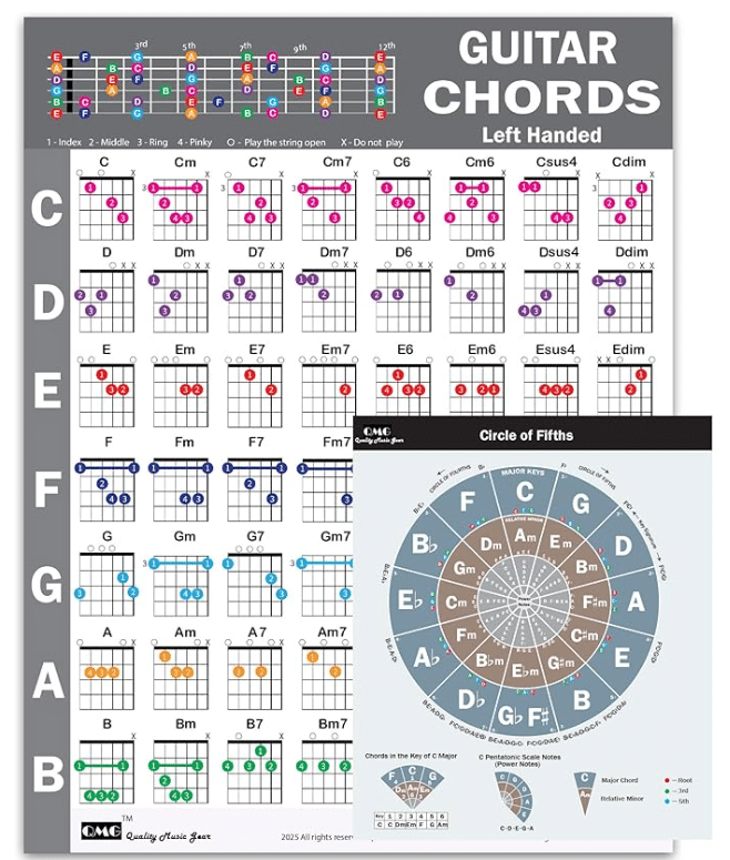 QMG Left Handed Guitar Chords Cheatsheet and Circle of Fifths Chart – Laminated A4 Music Theory Chart for Beginners
